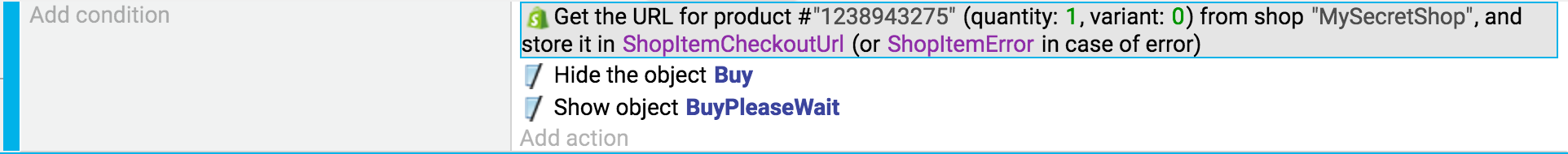 When you want the player, to open the page to buy a product, you must first get the URL to the product page, and then open it. The product identifier is needed for this, to let Shopify know which URL to generate. You also have to enter the name of the variable where the URL will be stored (as this can take a bit of time, depending on the network connection):