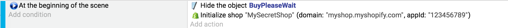 Use the action "Initialize a shop", entering the URL to your shop, the app ID that you got from the URL for the app (see above) and the app Storefront access token :
