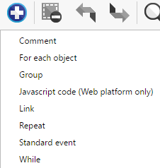 If you select the Add an new empty event icon, left click on the Add a new event shortcut link at the bottom of the event list, or click Standard Event in the Choose and add an event list above, GDevelop immediately creates a Standard event. Right-clicking the shortcut in the event list will show the list above, and choosing any special event type from either will will immediately create that event type