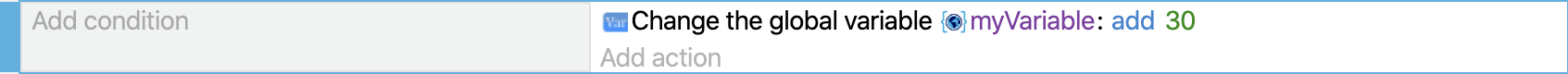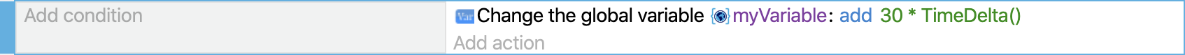 This action also increments a variable in every frame, but the value of the variable is multiplied by TimeDelta(). This ensures that the variable increments at the same speed, regardless of the frame rate. This guarantees that all players have the same experience.