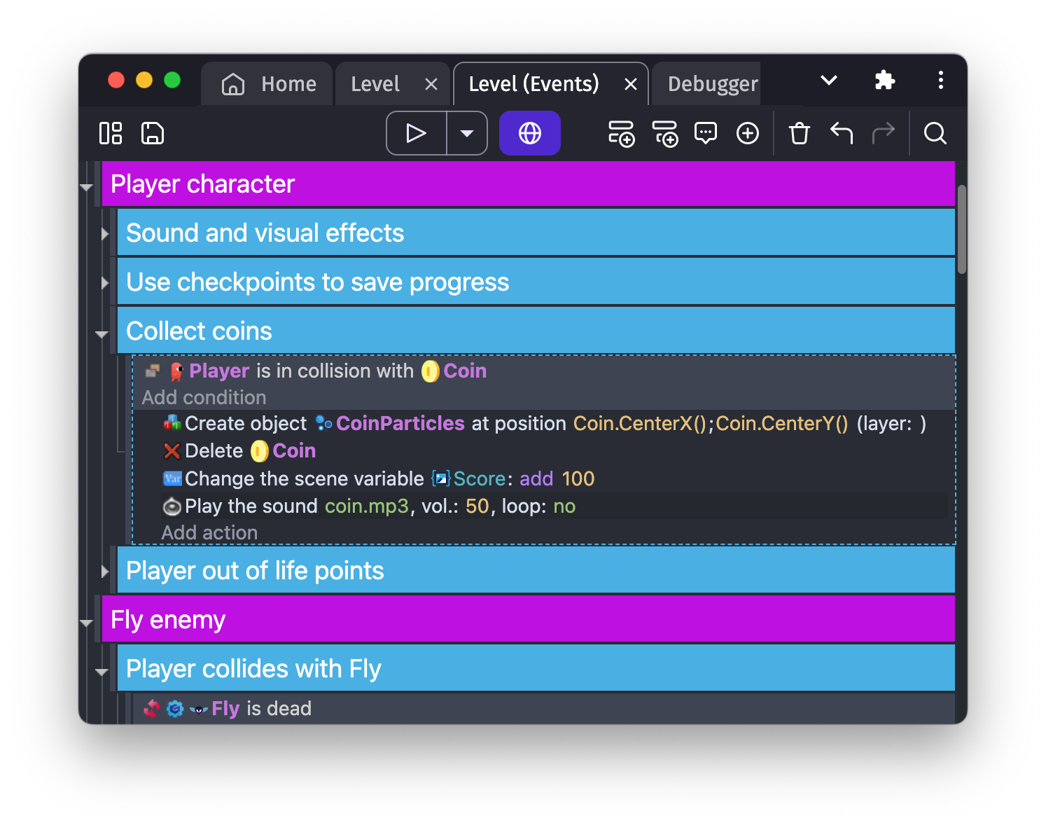Groups are used to organize and structure your events. They are useful to put together a set of events related to the same concept and make the Events Sheet more readable when it's growing.