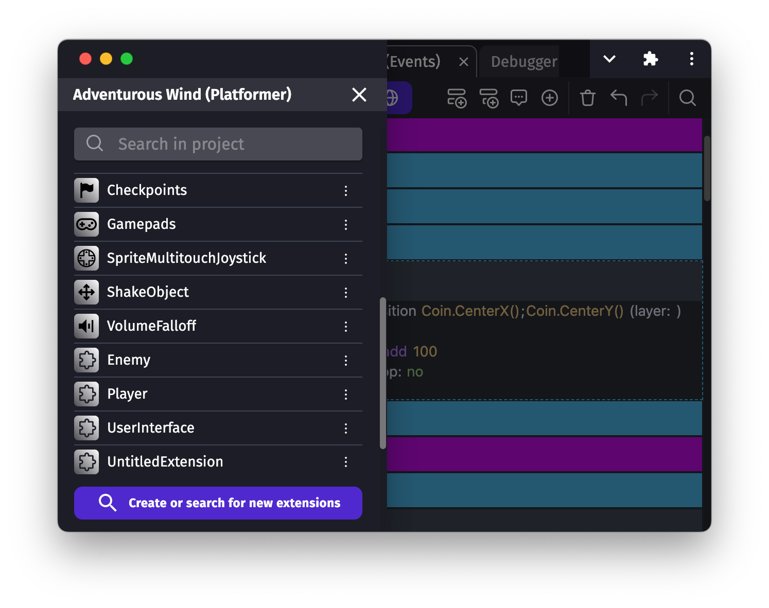 Finding new behaviors, conditions, actions or expressions for your game in GDevelop is easy. In the Project Manager, click on Create or search for new extensions: