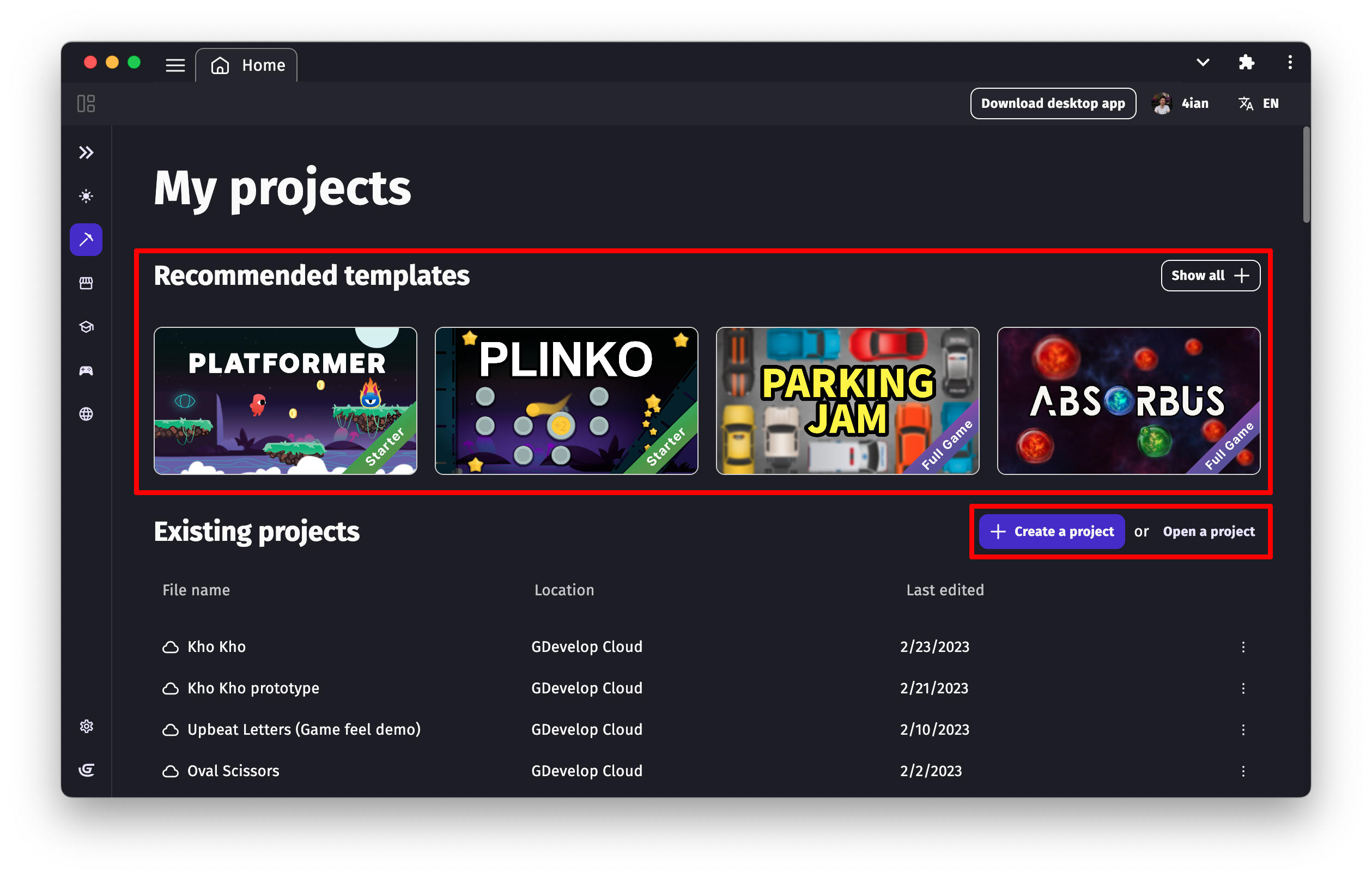 When launching GDevelop, you can choose a game template that can be customized in a few minutes (which is good for getting a try at game creation), open a game template in the editor or start from scratch.