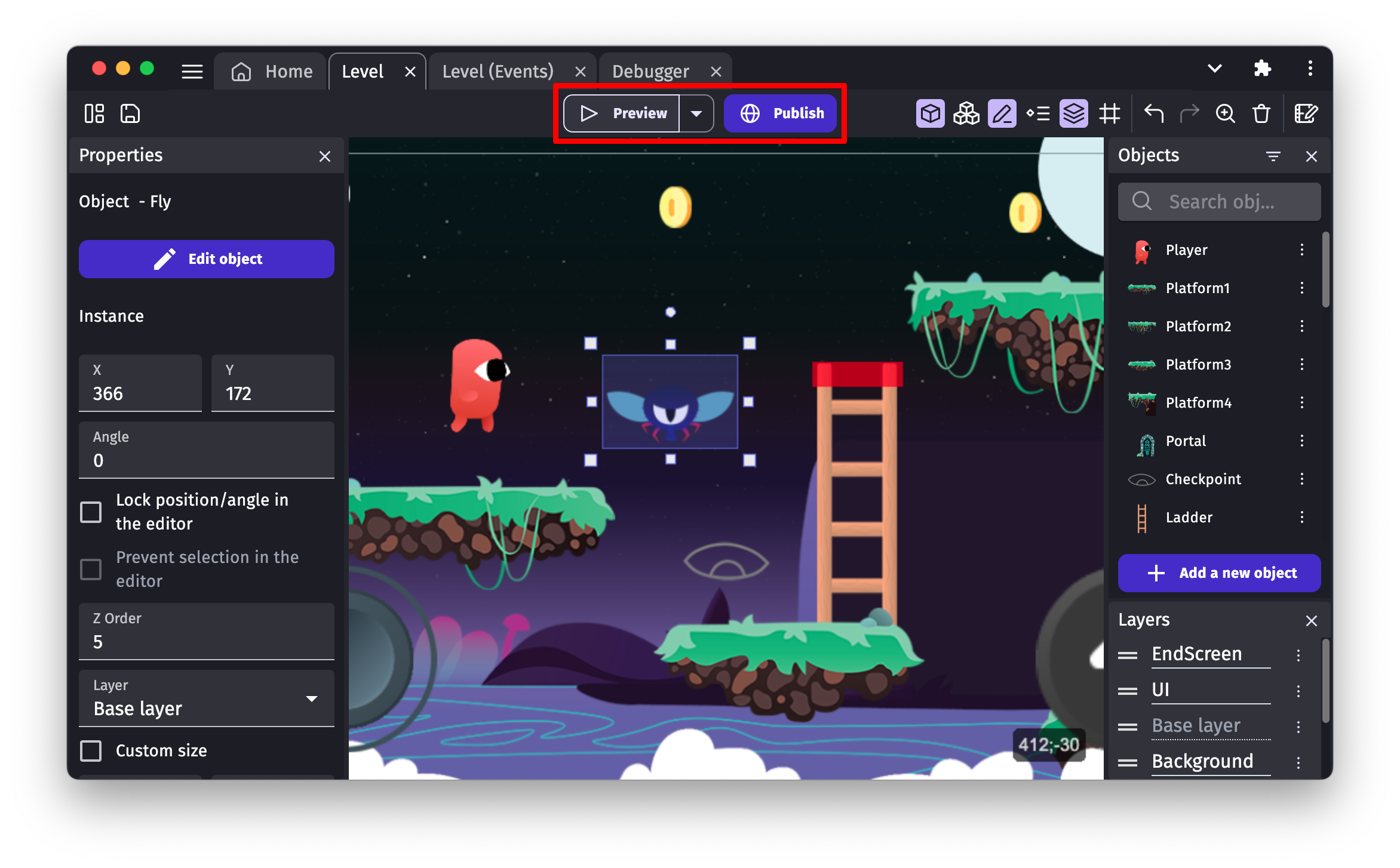 A Preview button is available via the toolbar. This button launches a preview of the game in a new window.