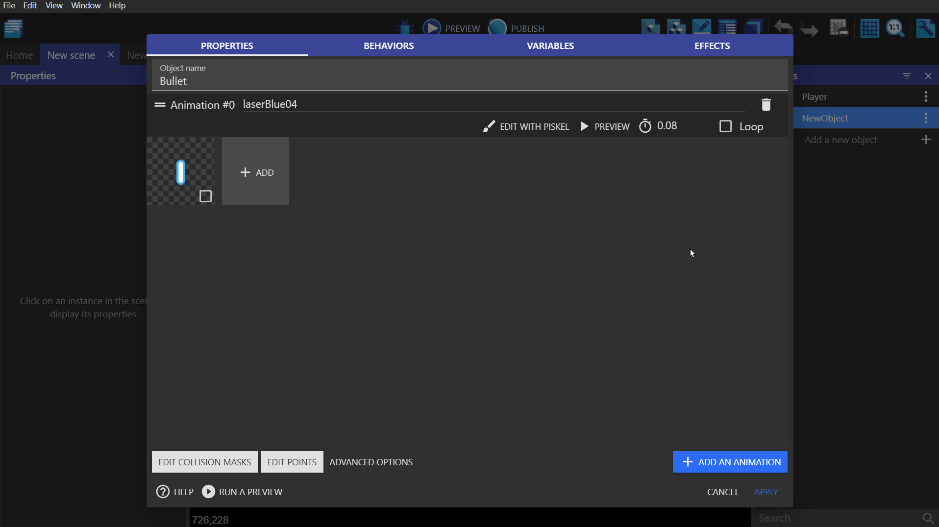 Create a sprite object, give it a single bullet animation, and name it Bullet.