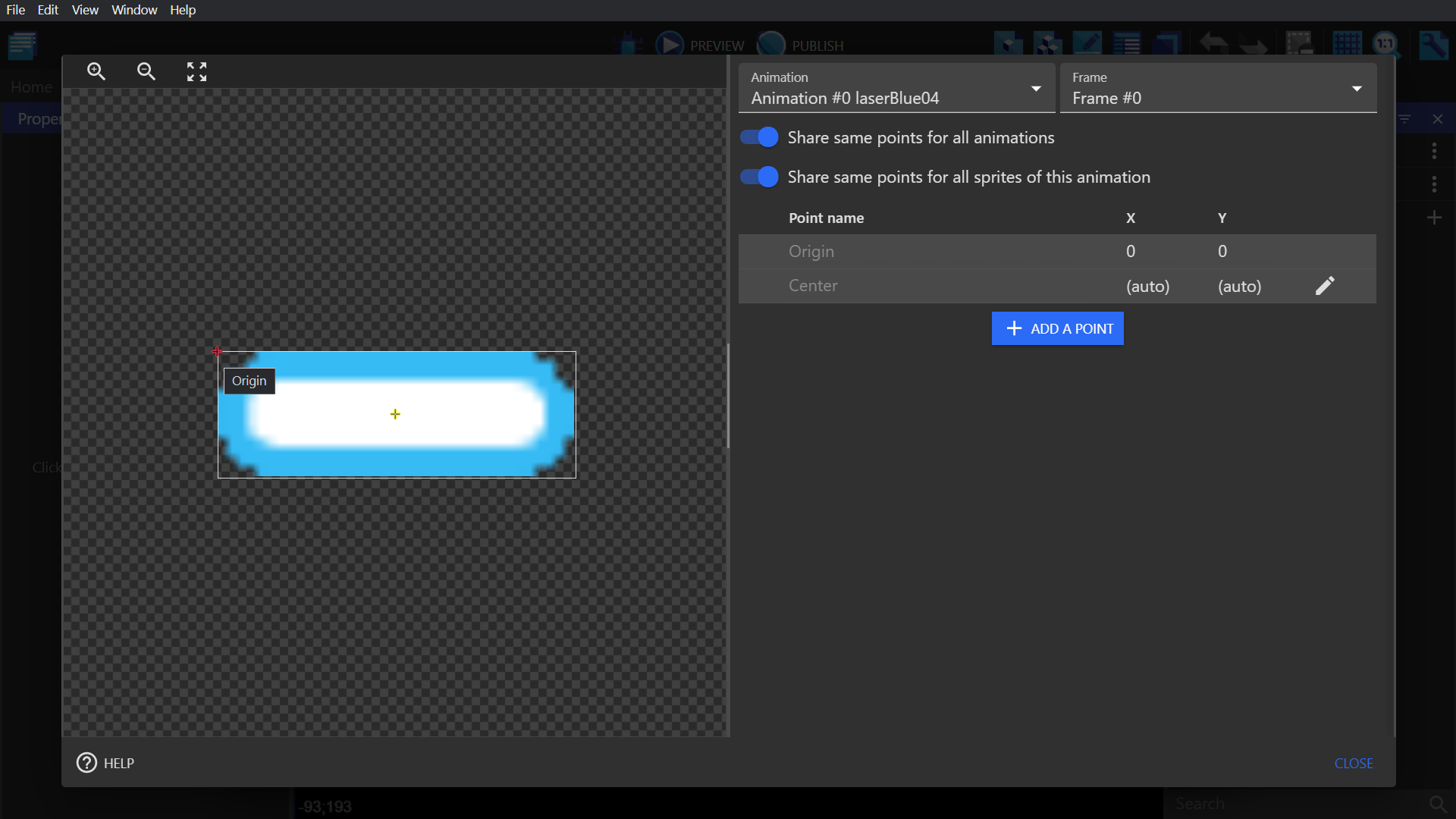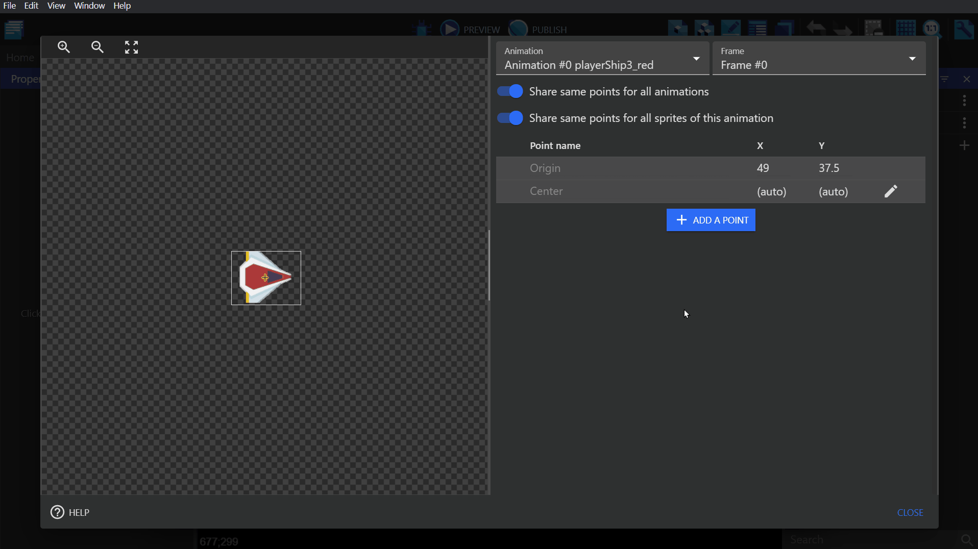 Go to your Player object and click "Edit points".\ Add a new point and place it in the middle of your ship, close to the nose. Name this point "BulletSpawn".