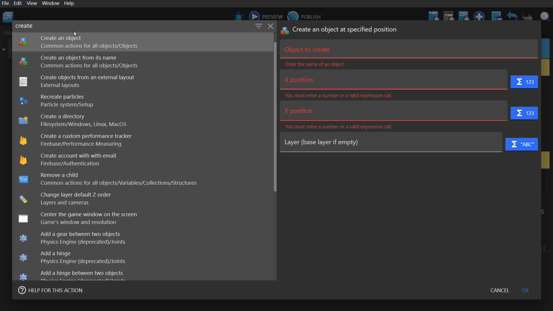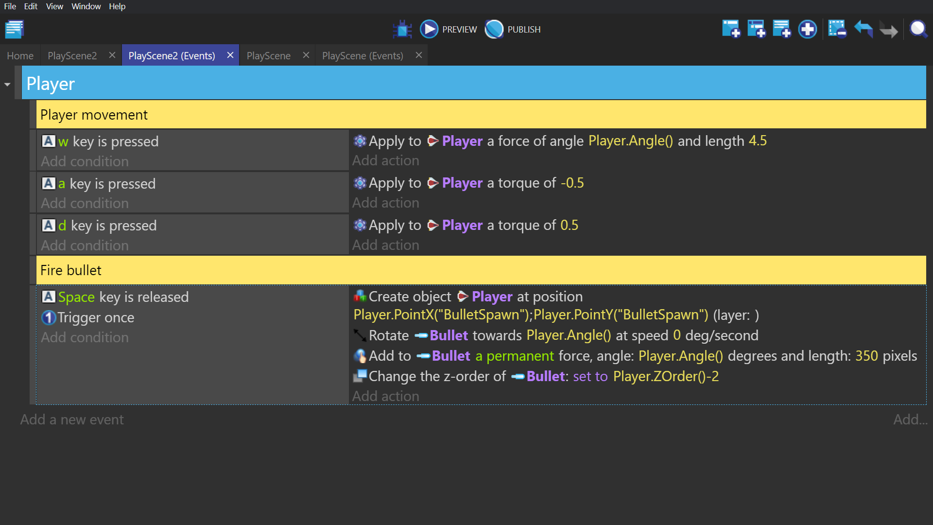 Action: -"Create object", Bullet, at the X and Y position of the earlier created "BulletSpawn" point. -"Rotate toward angle" using the angle of the Player, with an angular speed of 0. -"Add a force (angle)" (Common Action, not Physics Engine) using the Player object's angle and a speed of 350 pixels per second. Select permanent instead of instant. -"Z order" and use the expression builder to find the Z order of the Player object, and subtract that by 1. So the expression should read Player.ZOrder()-1.