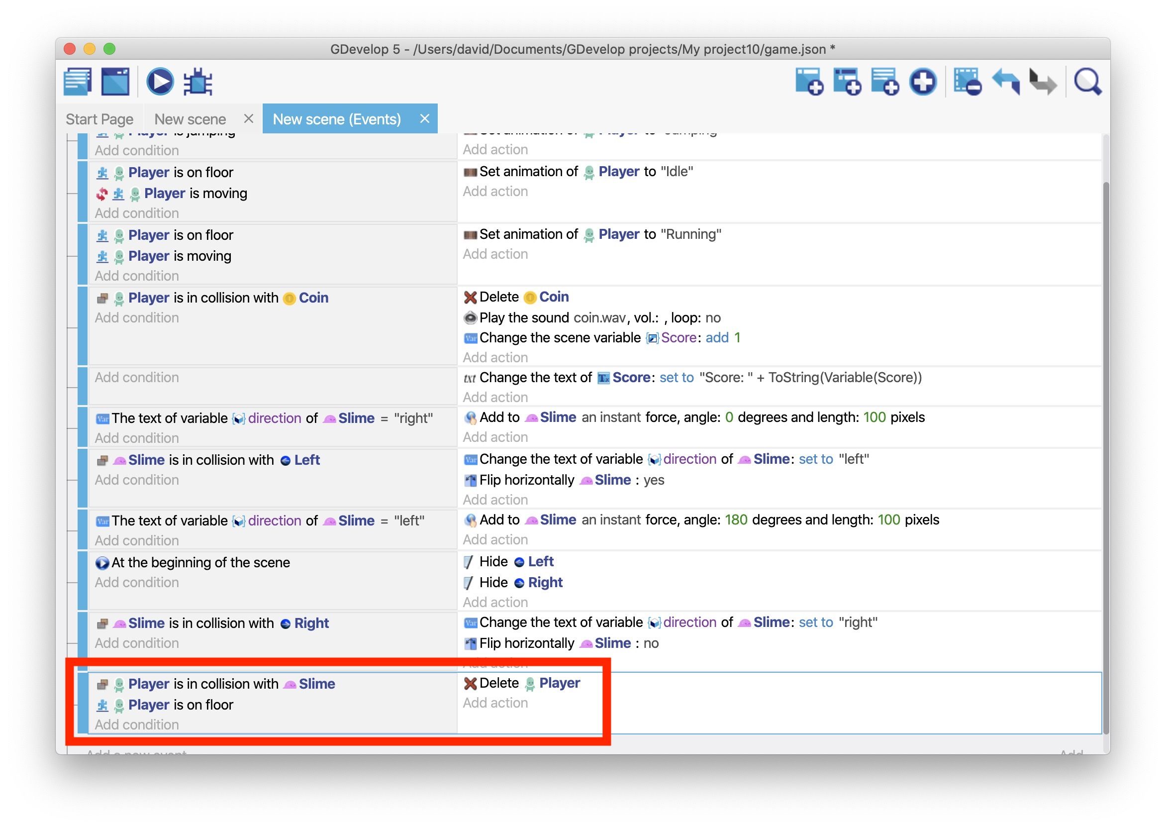 - Add a Collision condition that checks if the "Player" object is colliding with the "Slime" object.