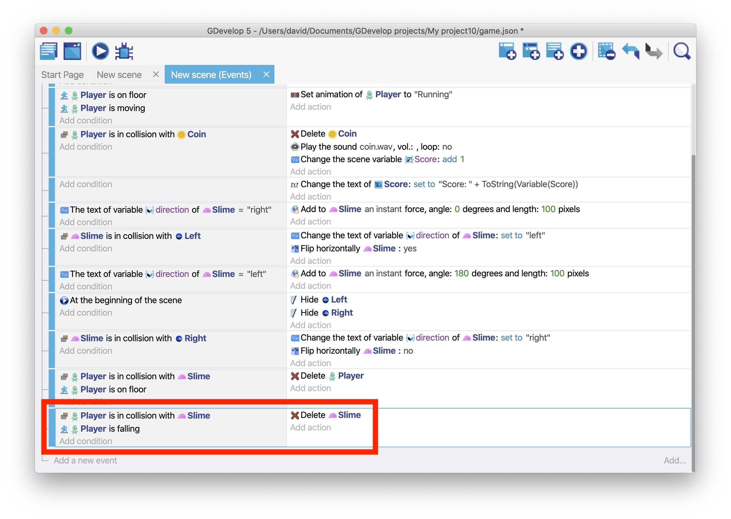 - Add the Delete an object action to the event that deletes the "Slime" object.