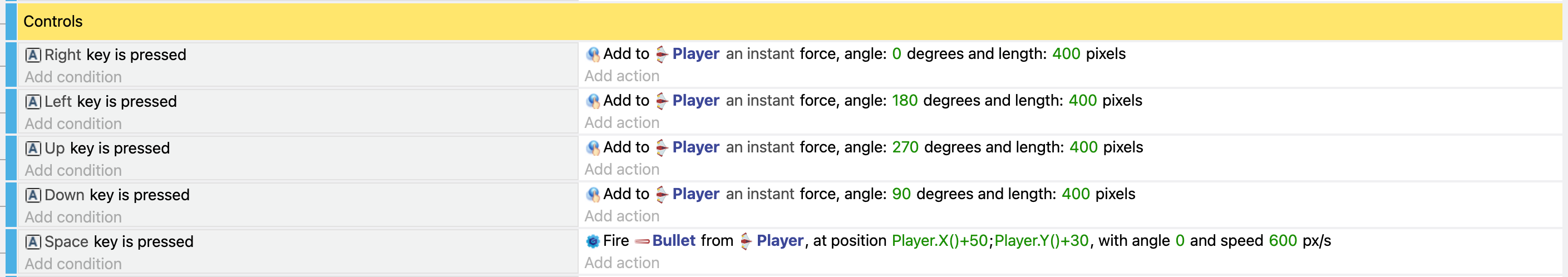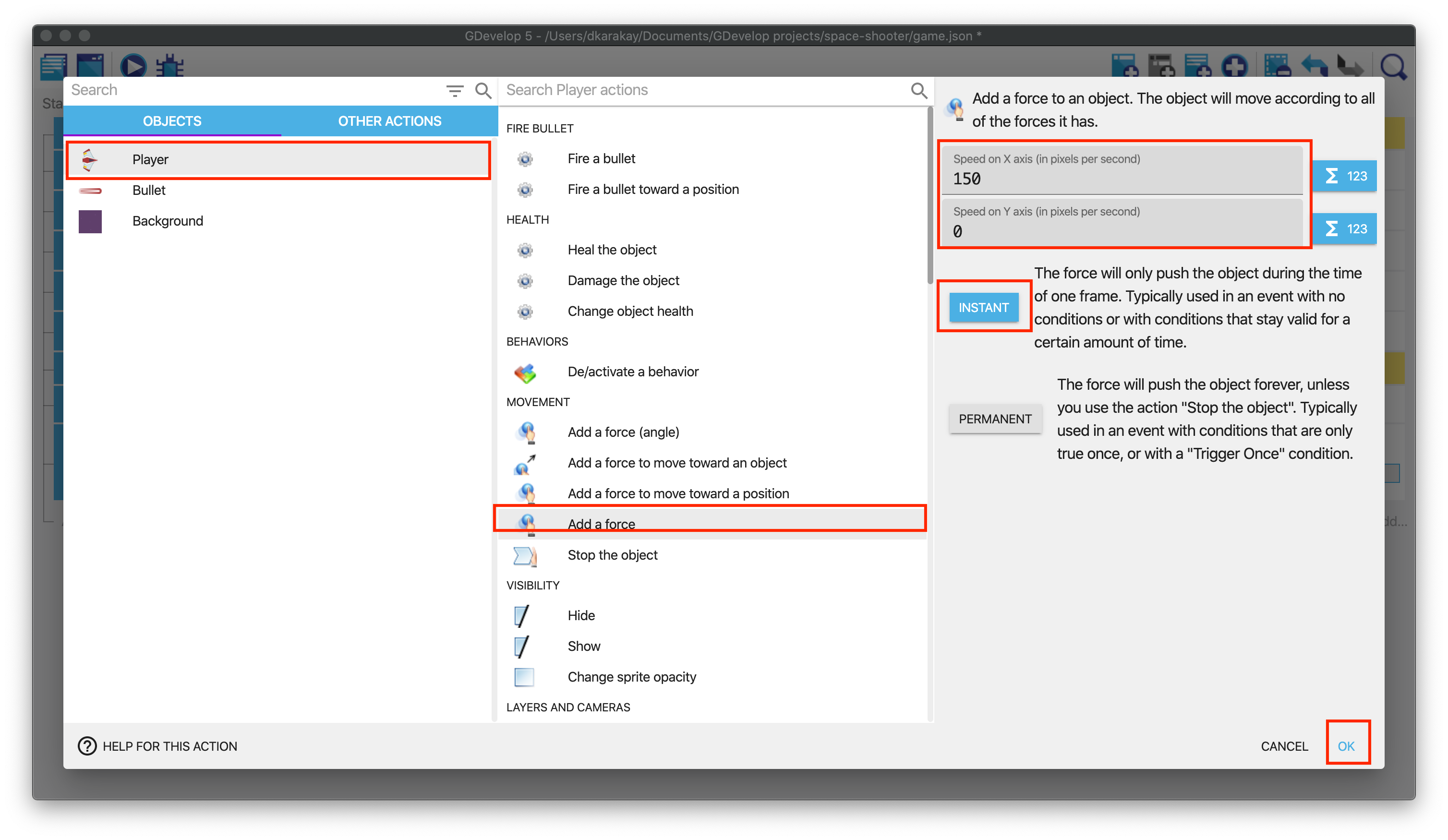 Make sure you select the Instant option. This means that it's a force that is making the object to move for a single frame. As the event will be executed on every frame, this is what we need. A permanent force is used when you want to use an action for a one-off event.