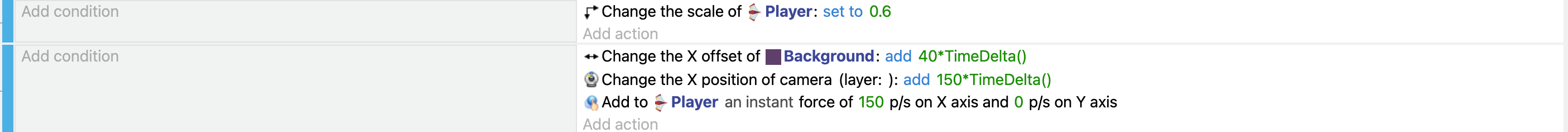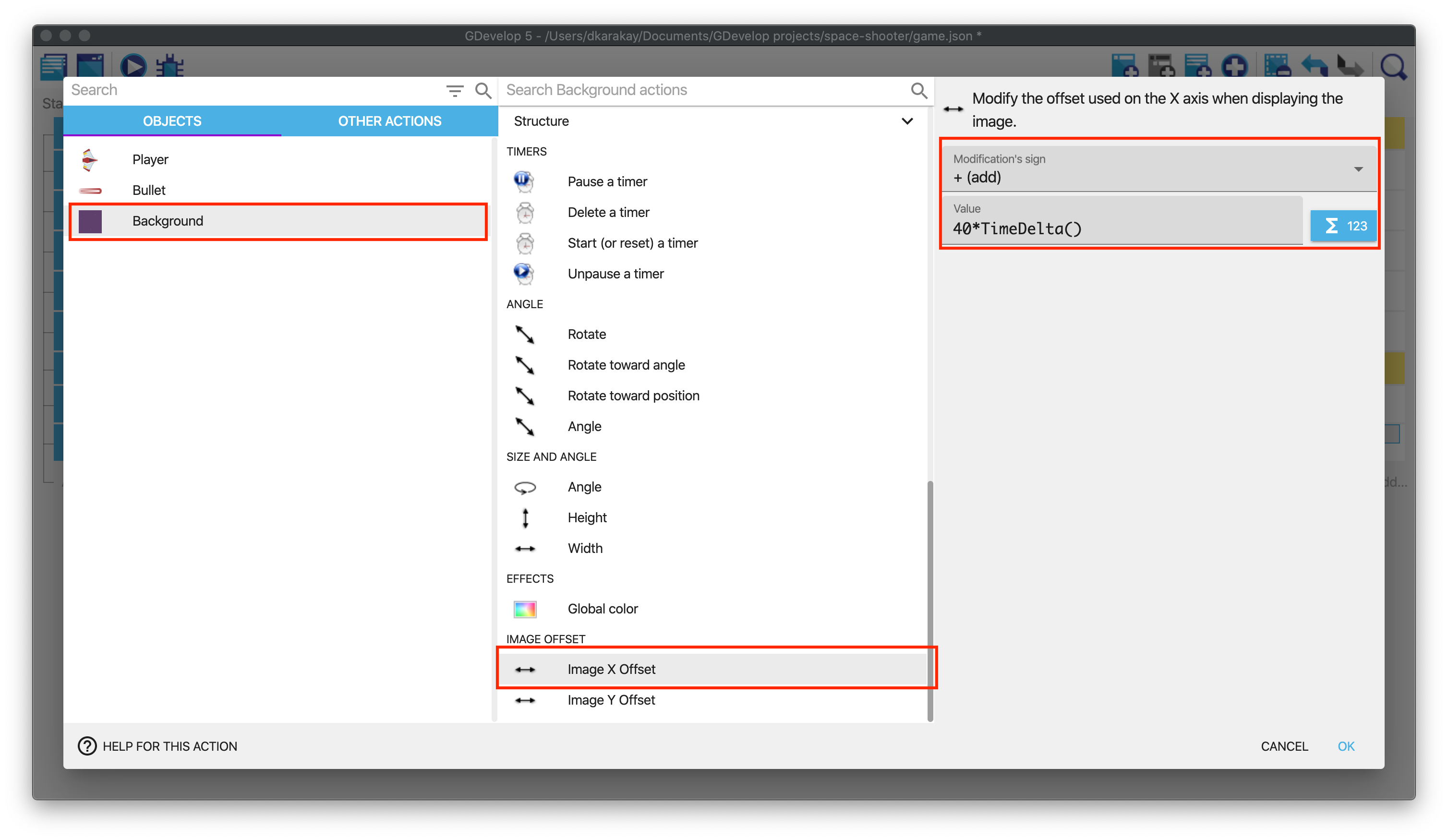 Add a new action under the previous one. This time choose Background object and select Image X offset. Change modification sign + (add) and fill the value with to 40 * TimeDelta().
