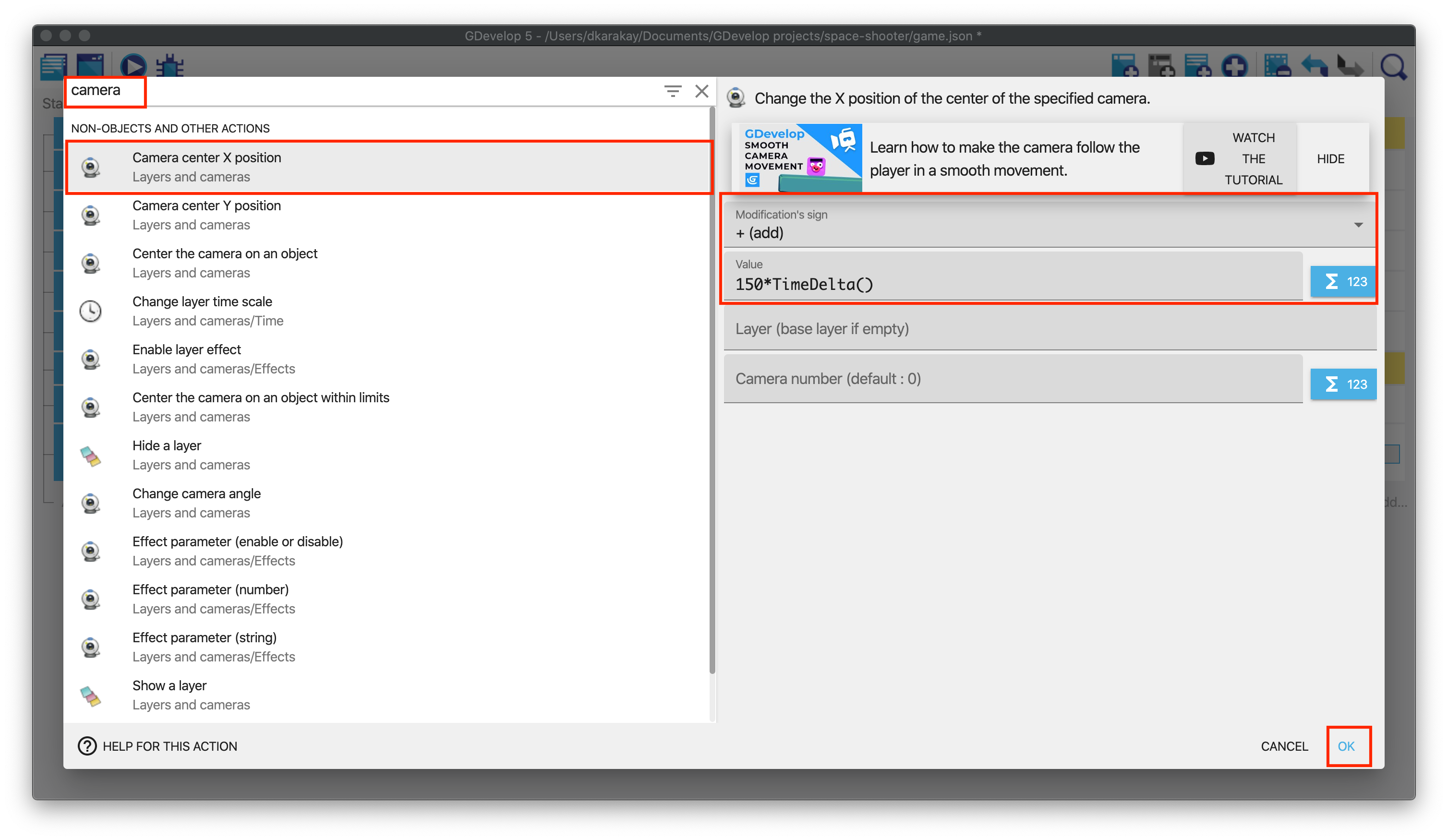 Open the Events tab. Create a new event and add a new action. Type "camera" on the search bar, and select the Camera center X position. Change modification sign + (add) and fill the value with to 150 * TimeDelta().