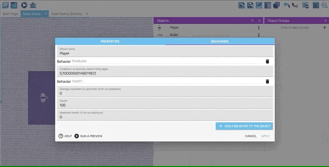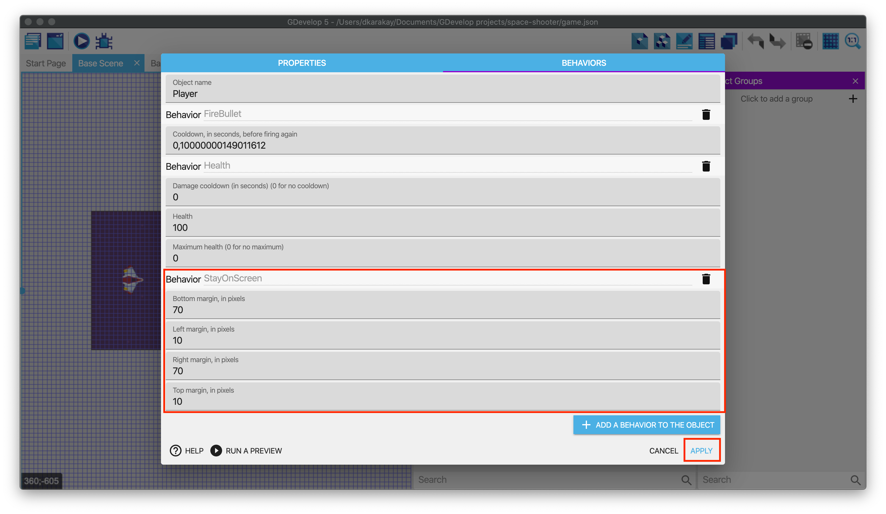 To make a player stay on the screen, we need to install a new behavior. So, open the Player behavior view, and add new behavior. Type "stay" on the search bar to find and install "Stay On Screen" behavior.